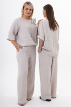 Костюм двухпредметный: состоит из жилета и брюк. Жилет назапах с полукруглым вырезом. Застёжка на петли и пуговицы на уровне плечевого шва. легантные брюки прямого кроя с боковыми карманами с отрезным бочком. Застежка на молнию и пуговицу. По переду - складки. Задние половинки с талиевыми вытачками и прорезными карманами с листочкой. Верхний срез обработан притачным поясом, по спинке на резинке.