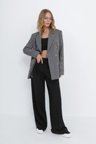 Костюм двухпредметный: состоит из блузы и юбки. Блуза свободного прямого кроя прямого силуэта с V-образным вырезом. Воротник стояче-отложной рубашечного типа, застёгивается на  пуговицу и петлю. Рукава объёмные, собраны на резинку. В боковых швах и по переду разрезы.Юбка - солнце с узким поясом. В боковых швах расположены карманы. Застёжка на петлю и пуговицу и молнию по спинке. В комплект входит ремень из экокожи.