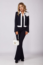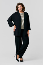 Костюм двухпредметный: состоит из жакета и брюк. Жакет рубашечного типа прямого силуэта с асимметричным низом. Рукав втачной со спущенной линией плеча, фиксируется на пату. Застежка центральная на петли и пуговицы, смещённая по косой. На левой полочке накладной карман с клапаном. Воротник отложной на стойке до половины спинки. Комфортные брюки свободного кроя со складками и карманами по переду, зауженные к низу. Пояс притачной со шлёвками и центральной застёжкой на гульфик и молнию. По спинке изделия накладные карманы и резинка.