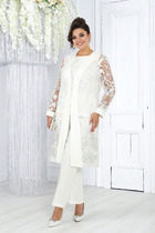 Костюм комбинированный двухпредметный: состоит из джемпера и брюк. Джемпер прямого свободного силуэта длиной до линии бедер, воротник хомут, рукав одношовный, втачной длиной до запястья. Спинка цельнокроеная. Перед состоит из двух частей- верхней и нижней. По нижней части переда сверху по центру вставка из отделочной ткани. По нижней части переда боковые накладные карманы из отделочной ткани, уходяшие в боковой шов, длинее линии низа переда вровень с линией низа спинки. Брюки прямого силуэта с наклонными карманами к боковым швам и лампасами из отделочной ткани. Пояс на резинке.