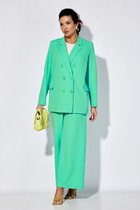 Костюм двухпредметный: состоит из брюк и жакета. Жакет свободного прямого силуэта со слегка заниженной линией плеча. Однобортная застёжка на петли и пуговицы. По переду два больших накладных кармана, на левом кармане нашивка. Воротник шалевый цельнокроенный. Спинка с центральным швом. Изделие на подкладке. Брюки средней посадки на резинке, слегка зауженные к низу с наклонными боковыми карманами. Низ брючины ассиметричный по переду