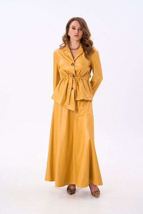 Костюм двухпредметный: состоит из жакета и юбки. Жакет прямого силуэта, воротник пиджачного типа, рукав одношовный, втачной с незначительно спущенной линией плеча, длинный, с притачной манжетой, декорированной разрезом. По линии ткани настрачная кулиса с завязками из основной ткани. Застежка центрально-бортовая. Линия низа верхней части фигурная ассиметричная. Юбка - солнце макси с узким поясом. В боковых швах расположены карманы. Застёжка на петлю и пуговицу и молнию по спинке.