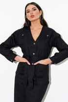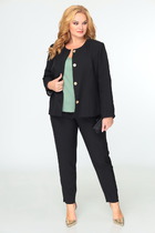 Костюм двухпредметный: состоит из блузы и брюк. Блуза свободного прямого кроя из комбинированной ткани. Воротник стояче-отложной рубашечного типа, застёжка центральная на петли и пуговицы. Рукав втачной одношовный с притачной манжетой на петлю и пуговицу. Спинка с отрезной кокеткой, нижняя часть спинки декорирована трикотажным гофре. Низ изделия по переду ассиметричный. Брюки свободного кроя, верхний срез представлен широкой резинкой, с карманами.