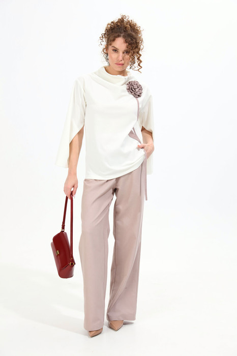 Костюм двухпредметный: состоит из джемпера и брюк. Джемпер-кейп прямого свободного силуэта. Горловина с цельнокроеным воротником-стойкой. Рукав втачной широкий, от линии локтя до запястья есть дополнительное отверстие для рук. Декорирован цветком из контрастной ткани. Прямые брюки с двойным поясом из отделочной контрастной ткани. Изделие по линии талии на резинке с имитацией гульфика. Карманы с отрезным бочком.