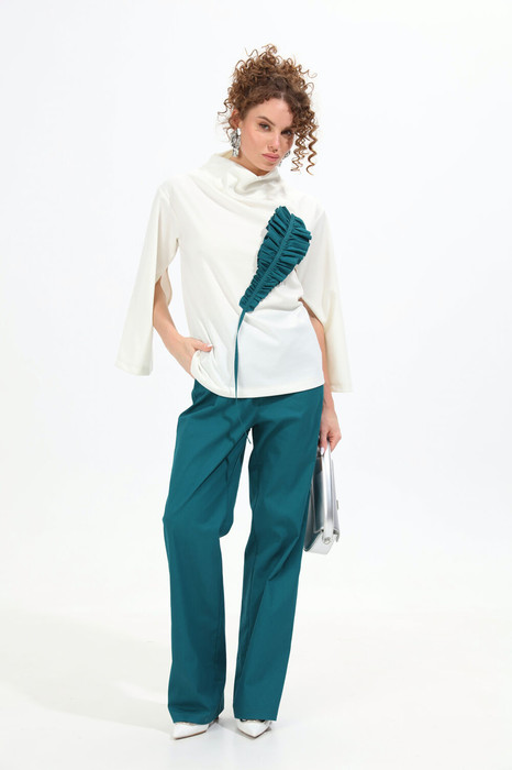 Костюм двухпредметный: состоит из джемпера и брюк. Джемпер-кейп прямого свободного силуэта. Горловина с цельнокроеным воротником-стойкой. Рукав втачной широкий, от линии локтя до запястья есть дополнительное отверстие для рук. Декорирован украшением из контрастной ткани. Прямые брюки с двойным поясом из отделочной контрастной ткани. Изделие по линии талии на резинке с имитацией гульфика. Карманы с отрезным бочком.
