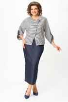 Костюм двухпредметный: состоит из жакета и брюк. Жакет прямого силуэта, воротник пиджачного типа, рукав одношовный, втачной с незначительно спущенной линией плеча, длинный, с притачной манжетой, декорированной разрезом. По линии ткани настрачная кулиса с завязками из основной ткани. Застежка центрально-бортовая. Линия низа верхней части фигурная ассиметричная. Брюки свободного кроя, верхний срез представлен широкой резинкой, с карманами.