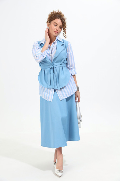 Костюм трёхпредметный: состоит из рубашки, жилета и юбки. Рубашка прямого силуэта с притачной планкой с застёжкой на петли и пуговицы. Рукав втачной одношовный со спущенной линией плеча с патой. Воротник рубашечный стояче-отложной. Перед состоит из трёх частей : центральная часть ,верхняя часть и нижняя часть. Спинка состоит из двух частей . Линия низа фигурная с широкой окантовкой. Жилет съёмный прямого силуэта без застёжки, воротник пиджачного типа. Линия низа фигурная, в комплект идёт пояс из основной ткани. Юбка - солнце с узким поясом. В боковых швах расположены карманы. Застёжка на петлю и пуговицу и молнию по спинке.