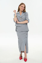 Костюм двухпредметный: состоит из жакета и юбки. Жакет прямого силуэта с имитацией центральной застёжки на пуговицы. Рукав втачной одношовный, длиной три четверти,застегивающийся на пату. Воротник пиджачного типа . Линия низа фигурная, симметричная . Юбка длиной миди, расклешенная к низу, с асимметричным низом. Пояс притачной, по спинке собран на резинку. Переднее полотнище состоит из трех частей. Правая часть скреплена отделочной строчкой и кнопками. В боковых швах изделия расположены карманы. По спинке изделия идёт средний шов и две вытачки для удачной посадки по фигуре. Юбка без подкладки.