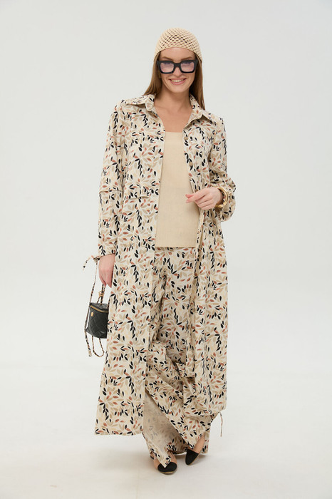 Костюм трехпредметный: состоит из кардигана-платья, брюк и топа. Платье-кардиган макси с центральной отрезной застёжкой на потайную планку на петли и пуговицы. По переду и спинке цельнокроеные складки на уровне талии. Рукав втачной, одношовный рубашечного типа. По низу рукава пробиты петли и вставлена завязка для фиксации сборки . Воротник рубашечный стояче отложной. В комплект к изделию идёт пояс из основной ткани для максимально комфортного регулирования объёма. Брюки свободного кроя, верхний срез представлен широкой резинкой, с карманами. По центру правой брючины расположена планка с функционирующими петлями и пуговицами. Топ на тонких регулируемых бретелях.