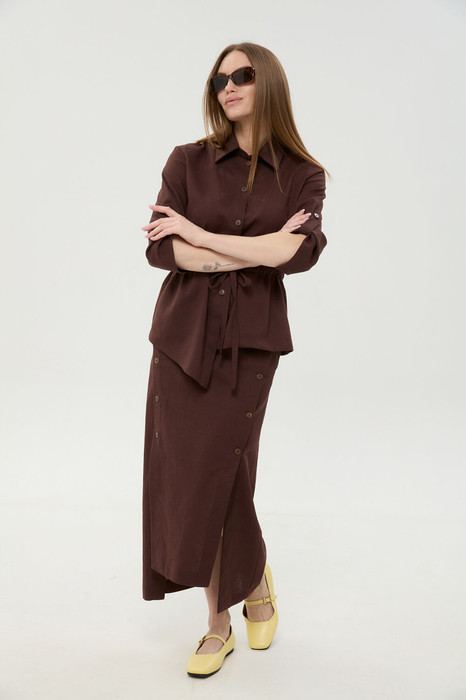 Костюм двухпредметный: состоит из жакета и юбки. Жакет прямого силуэта, воротник пиджачного типа, рукав одношовный, втачной с незначительно спущенной линией плеча, длиной три четверти, с патой. По линии ткани настрачная кулиса с завязками из основной ткани. Застежка центрально-бортовая. Линия низа верхней части фигурная ассиметричная. Юбка длиной миди, расклешенная к низу, с асимметричным низом. Пояс притачной, по спинке собран на резинку. Переднее полотнище состоит из трех частей. Правая часть скреплена отделочной строчкой и кнопками. В боковых швах изделия расположены карманы. По спинке изделия идёт средний шов и две вытачки для удачной посадки по фигуре. Юбка без подкладки.