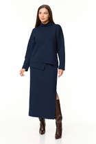 Костюм двухпредметный: состоит из жакета и брюк. Жакет рубашечного типа прямого силуэта с асимметричным низом. Рукав втачной со спущенной линией плеча, фиксируется на пату. Застежка фигурная на петли и пуговицы, смещённая по косой. Воротник рубашечный. Брюки с притачным поясом и с карманами в боковых швах.