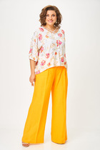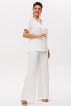 Представляем вам изысканный трех предметный костюм, который станет ярким украшением вашего гардероба на любом торжественном событии, будь то вечеринка, корпоратив, свадебное торжество или юбилей. Комплект брючный 3-х предметный, состоящий из кардигана, блузки и брюк. Кардиган выполнен из гипюра, силуэта "трапеция". Длина асимметричная: по переду короче, длиннее к середине спинки. Длина кардигана по посередине спинки 108,0 см. Линия горловины и борта оформлены отложным воротником-шалью. Рукава втачные, одношовные, длиной 59 см, по низу оформлены фестонами. Блузка выполнена из трикотажного полотна "масло", полуприлегающего силуэта, длиной по середине спинки 73.5 см. Перед с нагрудными вытачками, идущими от пройм, с настрочной кокеткой из гипюра, с фигурным низом. Спинка с талиевыми вытачками. Вырез горловины спинки и переда округлый, по переду с подрезной планкой, декорированной стразами. Рукава втачные, одношовные, длиной 27 см.