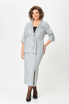 Комплект женский, состоящий из жакета и платья. Укороченный жакет полуприлегающего силуэта на подкладке. Деталь переда с двумя талевыми вытачками и с фигурным подрезом около горловины. Спинка со средним швом и рельефами, выходящими из проймы вниз. Рукава втачные, двухшовные, длиной 48,0 см., с разрезом по локтевому шву. Горловина углубленная, круглая, обтачная. Борта круглые, застежка на навесную петлю-пуговицу. Изделие с плечевыми накладками. Платье полуприлегающего силуэта, отрезное по линии талии. На детали переда рельефы выходят из проймы, проходят через центр груди вниз.  Спинка цельнокроеная, с талевыми выточками. Юбка широкая к низу, с тремя клиньями спереди и сзади.  Посередине каждого клина зашиты встречные складки. В левом боковом шве обработана застежка на потайную тесьму молнию. Рукава втачные, одношовные. Горловина углубленная, обтачная, с вырезом в виде “капельки” посредине переда. Углы выреза скреплены украшением. Пояс отлетной, обтачной, из двух цветов ткани, с перекантом на лицо и с застежкой на петлю-пуговицу сзади.  Изделие с плечевыми накладками.