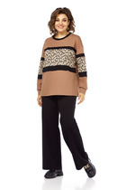 Комплект женский, состоящий из жакета и платья. Укороченный жакет полуприлегающего силуэта на подкладке. Деталь переда с двумя талевыми вытачками и с фигурным подрезом около горловины. Спинка со средним швом и рельефами, выходящими из проймы вниз. Рукава втачные, двухшовные, длиной 48,0 см., с разрезом по локтевому шву. Горловина углубленная, круглая, обтачная. Борта круглые, застежка на навесную петлю-пуговицу. Изделие с плечевыми накладками. Платье полуприлегающего силуэта, отрезное по линии талии. На детали переда рельефы выходят из проймы, проходят через центр груди вниз. Спинка цельнокроеная, с талевыми выточками. Юбка широкая к низу, с тремя клиньями спереди и сзади. Посередине каждого клина зашиты встречные складки. В левом боковом шве обработана застежка на потайную тесьму молнию. Рукава втачные, одношовные. Горловина углубленная, обтачная, с вырезом в виде “капельки” посредине переда. Углы выреза скреплены украшением. Пояс отлетной, обтачной, из двух цветов ткани, с перекантом на лицо и с застежкой на петлю-пуговицу сзади. Изделие с плечевыми накладками.