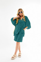 Туника полуприлегающего силуэта, выполнена из хлопкового кружева. Модель без застежки, без плечевых накладок, с высокими (от талии) разрезами в боковых швах. С изнанки разрезы обработаны хлопковой тесьмой в цвет кружева, закрепленной с лицевой стороны отделочной строчкой шириной 3 см. Круглый вырез горловины переда и спинки обработан обтачкой из костюмно-плательной ткани в цвет кружева; ширина отделочной строчки по горловине 2 см. Рукав втачной, короткий. Длина туники – 117 см; длина рукава – 22 см.