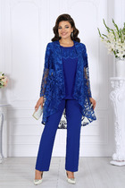Комплект состоит из трёх предметов: изысканного кардигана из гипюра, мягкой трикотажной блузки и классических брюк со стрелками. Такой ансамбль выглядит нарядно, подчеркивает женственность и формирует правильный силуэт даже для фигур plus size.