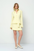 Блузка полуприлегающего силуэта, выполнена из трикотажного полотна «масло». Модель без плечевых накладок. Фигурный вырез переда с декоративным элементом в виде узора, выложенного шнуром из основной ткани. Горловина округлой формы, с отрезной бейкой по переду. Рукав короткий, втачной. Длина блузки – 63 см; длина рукава – 22 см.