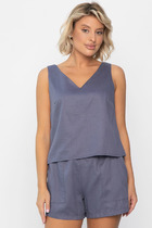 Блузка полуприлегающего силуэта, выполнена из трикотажного полотна «масло». Модель без плечевых накладок. Горловина округлой формы, спереди оформлена фигурным вырезом и отрезной бейкой. Рукав короткий, втачной. Длина блузки – 63 см; длина рукава – 23 см.