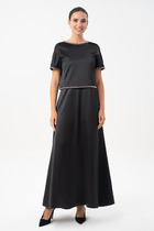 Брюки классические длинные, прямого силуэта, с посадкой на талии, выполнены из трикотажного полотна с фактурной лицевой стороной «люрекс». Модель без застёжки, на притачном поясе, с эластичной лентой внутри. Передние половинки брюк с боковыми наклонными карманами. Длина брюк по боковому (с поясом) - 108 см.