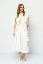 Блузка приталенного силуэта, выполнена из вискозного полотна. Модель со спущенной линией плеча, без воротника, без рукавов и плечевых накладок. По линии талии спинки и частично переда с изнанки настрочена кулиса с широкой эластичной лентой внутри. Перед с застежкой на 8 петель и 8 пуговиц, расположенных по 4 пары через равные расстояния. Горловина по спинке округлая, спереди V-образная. Квадратная пройма оформлена обтачной фигурной планкой. Длина блузки – 65 см.