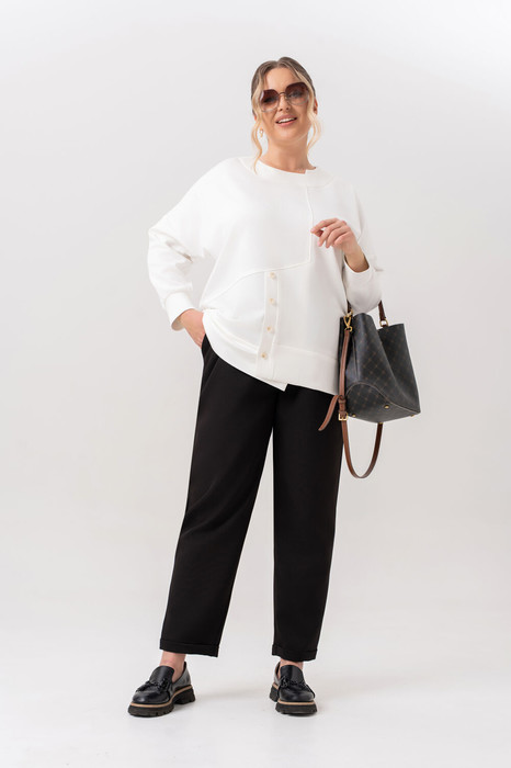 Позвольте себе насладиться комфортом и стилем с нашим женским брючным костюмом-двойкой, который станет вашим незаменимым спутником. Этот костюм, состоящий из стильного свитшота и брюк с манжетой, предполагает легкость и свободу движений, что делает его идеальным для повседневной носки и прогулок на свежем воздухе. Изготовленный из качественного трикотажа, он обеспечивает дышащие свойства и гипоаллергенность, что особенно важно для женщин с чувствительной кожей. Свитшот с круглой, асимметричной горловиной и манжетами на запястьях добавляет образу женственности и утонченности. На полочке обработана нефункциональная, декорированная пуговицами планка. На спинке, в среднем шве, обработана потайная молния. Брюки с удобной высокой посадкой и боковыми карманами позволяют хранить мелкие вещи, такие как ключи или смартфон, что делает этот костюм не только стильным, но и практичным. Пояс частично на резинке, застежка в брюках на молнию и петлю с пуговицей. Универсальность костюма позволяет использовать его как стильный комплект для выхода в свет. Он легко сочетается с различными аксессуарами и обувью, что дает возможность создавать разнообразные образы.
