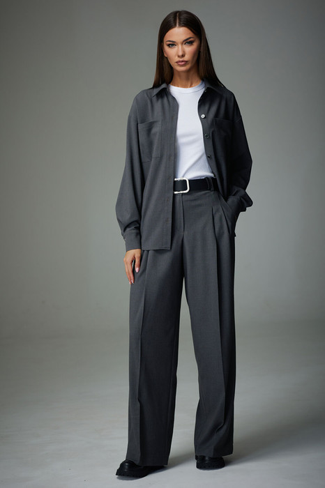 Комплект прямого силуэта, состоит из блузы и брюк. Блуза покроя спущенное плечо. Рукав одношовный, с притачной манжетой, по низу застегивается на две пуговицы. Горловина оформлена стояче-отложным воротником с отрезной стойкой. На спинке расположена встречная складка, отстроченная отделочной строчкой. По переду, в области груди, расположены накладные карманы прямоугольной формы. Низ блузы закругленной формы.