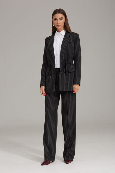 Комплект женский, двухпредметный, состоит из жакета и брюк. Выполнен из костюмно-плательной ткани в полоску.