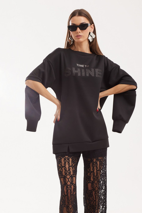 Блузон свободной формы «оверсайз» со спущенным плечом выполнен из трикотажного полотна. Горловина округлой формы обработана планкой. Перед и спинка цельные по низу с планкой и с разрезом по переду. Рукава с планками и с разрезами по линии локтя, по низу – на манжете и слегка присборены. На детали переда расположена печать в цвет брюк.