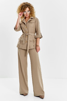 Брюки прямые, свободные. Верхний срез оформлен поясом, застегивающимся на петлю-пуговицу. На поясе шлевки, застежка с гульфиком на тесьму-молнию. В боковых швах выполнены наклонные карманы. На задней правой половинке брюк выполнен прорезной карман в рамку с петелькой и пуговицей отделочной (карман не функциональный)