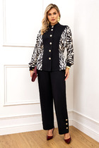 Шикарный костюм, состоит из жакета и брюк. Жакет, полуприлегающего силуэта, с лацканами, центральной застежкой на три пуговицы. На полочке карманы в рамку с клапанами. По спинке средний шов со шлицей. Рукав длинный. Брюки прямые, слегка зауженные к низу, на поясе, по спинке резинка. Карманы в боковых швах.