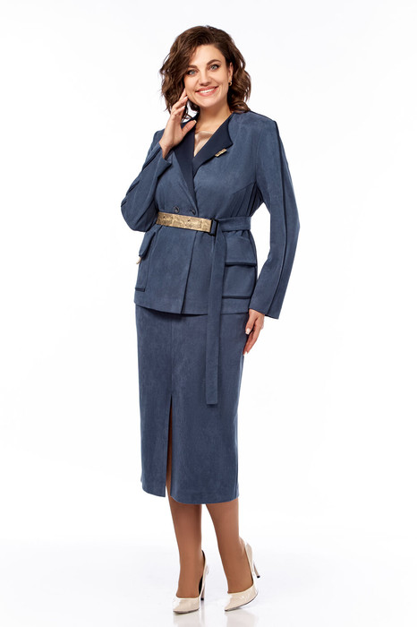 Шикарный костюм тройка из мягкого приятного велюра. Жакет без подкладки, полуприлегающего силуэта, с втачными рукавами, с двубортной застежкой на две петли и пуговицы. Жакет без воротника с отложными лацканами из отделочной ткани. Также отдека используется на рукавах и карманах настрочных на полочке, еще для отделки используется тесьма на клапане, поясе из основной ткани и лацкане. Блузка полуприлегающего силуэта со спущенным рукавом, в боковых швах разрезы. Юбка удлиненная, прямого силуэта. слегка заужена к нзу. По центру спереди разрез, застежка по спинке на пуговицу и тесьму -молнию.