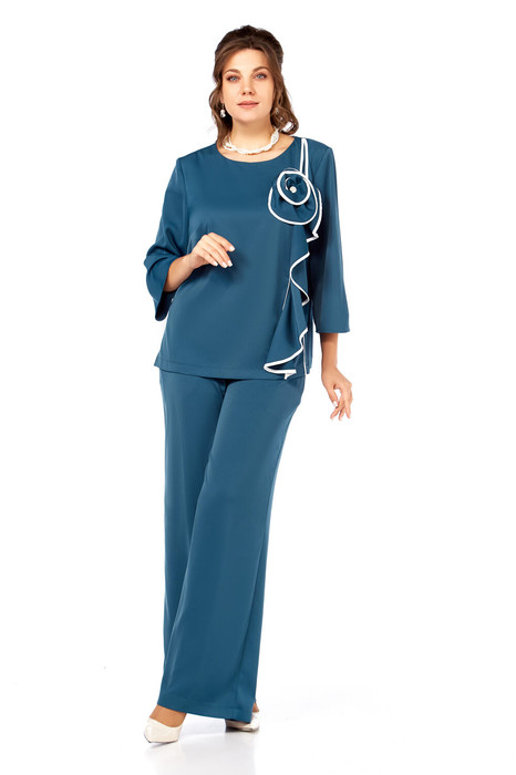 Стильный нарядный костюм из мягкой струящейся ткани. Блуза прямого силуэта с декоративным цветком, пришивным. Спинка со средним швом, в котором потайная молния. Рукав прямой. Разрезы в боковых швах. Брюки прямые с карманами в боковых швах. Пояс на резинке по спинке, по переду молния и петля и пуговица.