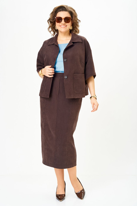 Комплект женский, состоящий из жакета и юбки, выполнен из однотонной костюмно-плательной ткани, блуза выполнена из трикотажного полотна.