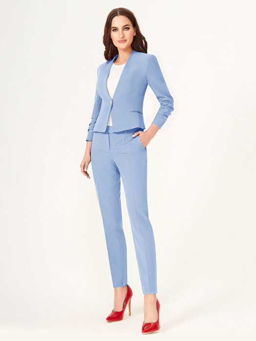 Стильный лаконичный брючный костюм. Жакет с застежкой на одну пуговицу. Жакет полуприлегающего силуэта, с V-образным вырезом горловины. По переду и по спинки имеются вытачки и рельефы, которые обеспечивают отличную посадку изделия по фигуре. Рукава втачные, длиной 3/4. Брюки классические на поясе, укороченые, с карманами по переду. Отличный вариант как для деловых встреч, так и для торжественных мероприятий.