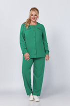 Стильный лаконичный брючный костюм. Жакет с застежкой на одну пуговицу. Жакет полуприлегающего силуэта, с V-образным вырезом горловины. По переду и по спинки имеются вытачки и рельефы, которые обеспечивают отличную посадку изделия по фигуре. Рукава втачные, длиной 3/4. Брюки классические на поясе, укороченые, с карманами по переду. Отличный вариант как для деловых встреч, так и для торжественных мероприятий.