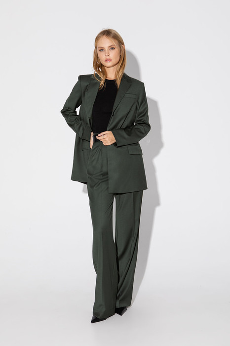 Текстильный костюм-двойка из трапециевидного жакета с высокой шлицей по спинке и прямых брюк со стрелками. Детали: свободный покрой, пиджачный воротник, талиевые вытачки, функциональный нагрудный карман, прорезные карманы с клапанами, застежка на пуговицы, спинка со средним швом и высокой шлицей, рукава втачные двухшовные, жакет на подкладке. Брюки с высокой посадкой на притачном поясе со шлевками, передние половины с небольшими застроченными мягкими складками и заутюженными стрелками, застежка на молнию и пуговицу, боковые карманы.