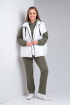 Костюм-двойка из полуприлегающего жакета со шлицами и широких брюк. Детали: пиджачный воротник, талиевые вытачки, перед с функциональным нагрудным карманом и двумя прорезными карманами, застежка на пуговицы, спинка со средним швом и шлицей, рукава втачные двухшовные со шлицами по низу, жакет на подкладке. Брюки с высокой посадкой на притачном поясе со шлевками, передние половины с небольшими застроченными мягкими складками и заутюженными стрелками, застежка на молнию и пуговицу, боковые карманы.