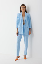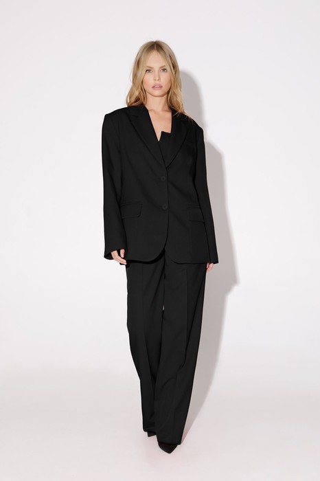 Костюм-двойка из оверсайз жакета с расширенной линией плеч и прямых брюк-палаццо со стрелками. Детали: жакет прямого силуэта, пиджачный воротник, перед с прорезными функциональными карманами, однобортная застежка на петли и пуговицы, спинка со средним швом и шлицей, рукава втачные двухшовные, жакет на подкладке. Брюки с высокой посадкой на притачном поясе со шлевками, застежка на молнию и пуговицу, боковые карманы, передние половины с заутюженными стрелками и двумя небольшими складками.