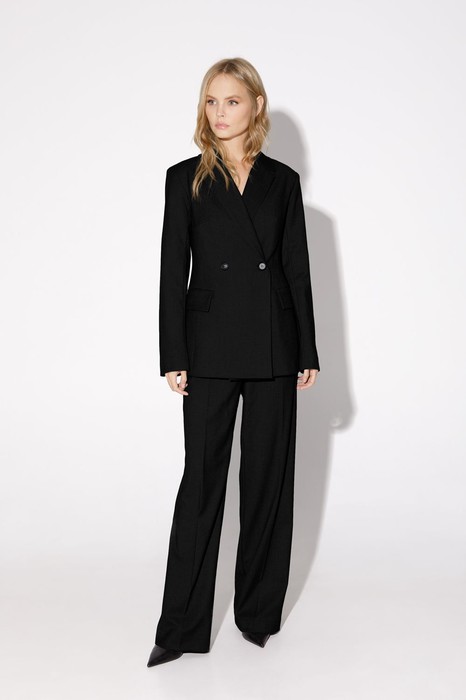 Текстильный костюм-двойка из двубортного полуприлегающего жакета и прямых брюк со стрелками. Детали: жакет с отрезными бочками и нагрудными вытачками, пиджачный воротник, прорезные карманы, застежка на петли и пуговицы, спинка со средним швом, втачные двухшовные рукава, жакет на подкладке. Брюки с высокой посадкой на притачном поясе со шлевками, передние половины с небольшими застроченными мягкими складками и заутюженными стрелками, застежка на молнию и пуговицу, боковые карманы.