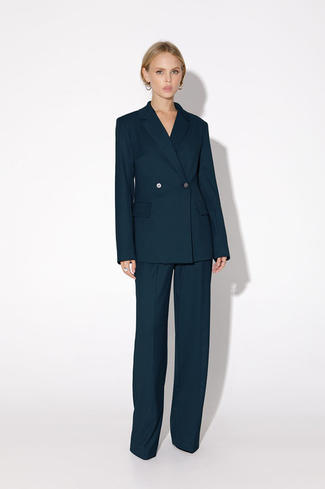 Текстильный костюм-двойка из двубортного полуприлегающего жакета и прямых брюк со стрелками. Детали: жакет с отрезными бочками и нагрудными вытачками, пиджачный воротник, прорезные карманы, застежка на петли и пуговицы, спинка со средним швом, втачные двухшовные рукава, жакет на подкладке. Брюки с высокой посадкой на притачном поясе со шлевками, передние половины с небольшими застроченными мягкими складками и заутюженными стрелками, застежка на молнию и пуговицу, боковые карманы.