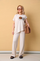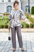 Длина жакета по спинке около 48 см в размерах 40-46 и около 51 см в размерах 48-52, длина рукава около 65 см. Длина юбки по боковому шву с поясом около 46 см в размерах 40-46 и около 49 см в размерах 48-52 см.