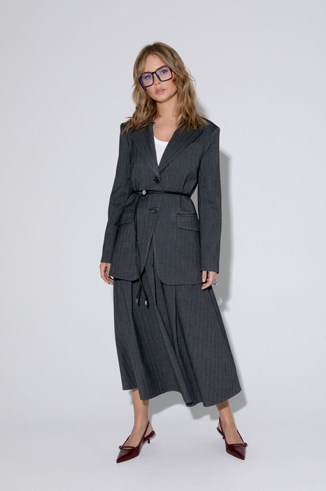 Костюм-двойка из приталенного жакета и миди-юбки в складку из текстильной ткани с рисунком «ёлочка».
