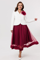 Длина жакета по спинке около 69 см в размерах 40-46 и около 72 см в размерах 48-52, длина рукава около 62 см. Длина брюк по боковому шву с поясом около 109,5 см, длина по внутреннему шву около 83 см