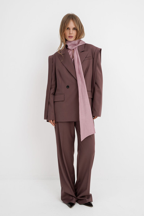 Детали: жакет свободного покроя и полуприлегающего силуэта, двубортная застежка на петли и пуговицы, отрезные бочки, пиджачный воротник, функциональные карманы, жакет на подкладке, съемный пояс. Брюки с высокой посадкой на притачном поясе со шлевками, передние половины с небольшими застроченными мягкими складками и заутюженными стрелками, застежка на молнию и пуговицу, боковые карманы. Задние части брюк с вытачками и имитацией карманов.