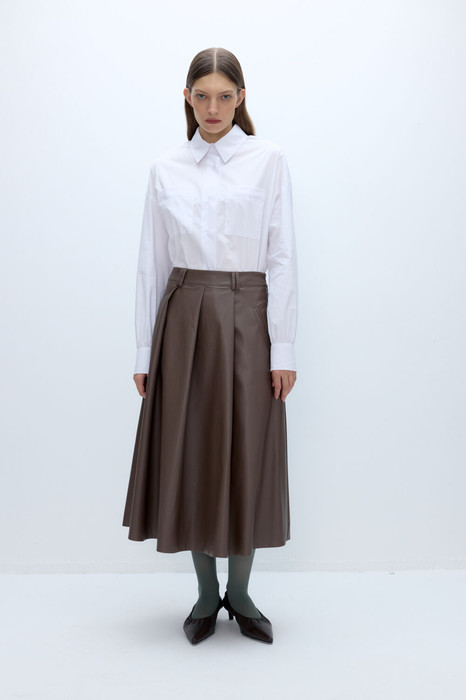 Комплект-дво йка из хлопковый оверсайз рубашки и миди-юбки из экокожи.