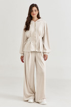 Длина жакета по спинке около 66 см в размерах 40-46 и около 69 см в размерах 48-52, длина рукава около 61 см. Длина брюк по боковому шву с поясом около 96,5 см в размерах 40-46 и около 98 см в размерах 48-52. Длина по внутреннему шву около 69 см.