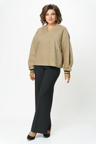 Детали: жакет прямого силуэта, пиджачный воротник, перед с прорезными карманами, застежка на петли и пуговицы, спинка со средним швом, рукава втачные двухшовные, жакет на подкладке. Брюки на притачном поясе со шлевками, передние половины с небольшими мягкими складками и заутюженными стрелками, застежка на молнию и пуговицу, боковые карманы.