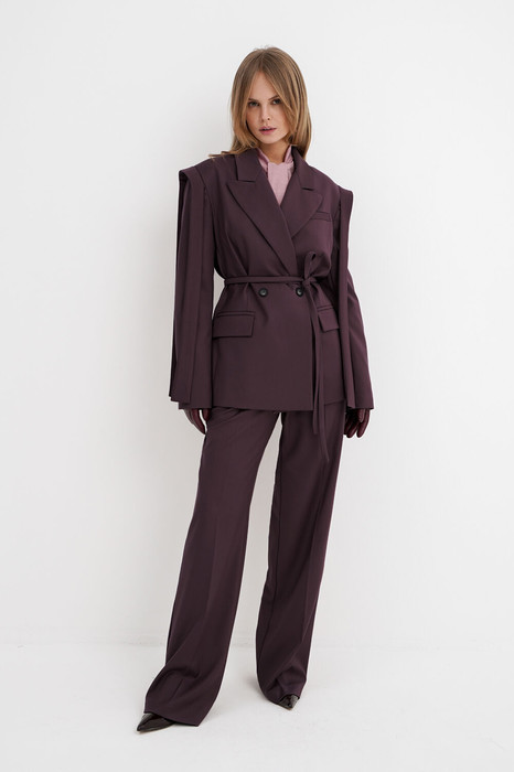 Детали: жакет свободного покроя и полуприлегающего силуэта, двубортная застежка на петли и пуговицы, отрезные бочки, пиджачный воротник, функциональные карманы, жакет на подкладке, съемный пояс. Брюки с притачным поясом со шлевками, передние половины с небольшими застроченными мягкими складками и заутюженными стрелками, застежка на молнию и пуговицу, боковые карманы. Задние части брюк с вытачками и заутюженными стрелками. Пояс брюк прямой, без резинки.