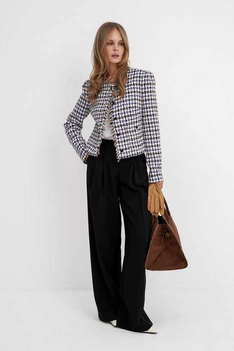 Костюм-двойка из укороченного жакета из фактурной ткани в стиле «шанель» и брюк-палаццо.