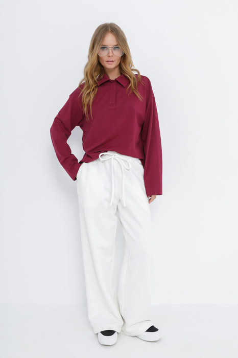 Детали: поло прямого силуэта, свободный покрой, спущенная линия плеча, потайная застежка на петли и пуговицы, длинные рукава. Брюки с высокой посадкой, эластичный пояс с резинкой, боковые карманы, без застежки.
